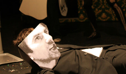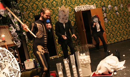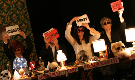 In a self-experiment Heiner Müller’s “Hamletmaschine” becomes a game, where the text is at stake: “end of drama, begin of game”. A wheel of fortune stands on the stage, the playgrounds correspond to the five acts, hazard determines the plot of the evening, as well as a host, who examines how true the players stay to the text. The performance is a concert and a collective reading at the same time, a walk through the text and a ghost ride through history: Hamlet, torn between melancholy and revolt in East-Berlin in 1953, Budapest 1956, Stuttgart-Stammheim 1977: “My drama, if it were still to take place, would take place in times of revolt.” Ghostlike, Ophelia wanders through the bourgeois living room, where the things slowly get out of hand: Walls move, couches are attacking, the wardrobe becomes a den of thieves, a lonely heart bleeds and sings a quiet farewell-song. “Denmark is a prison, a wall is growing between us. Look what is growing out of the wall. Exit Polonius.”